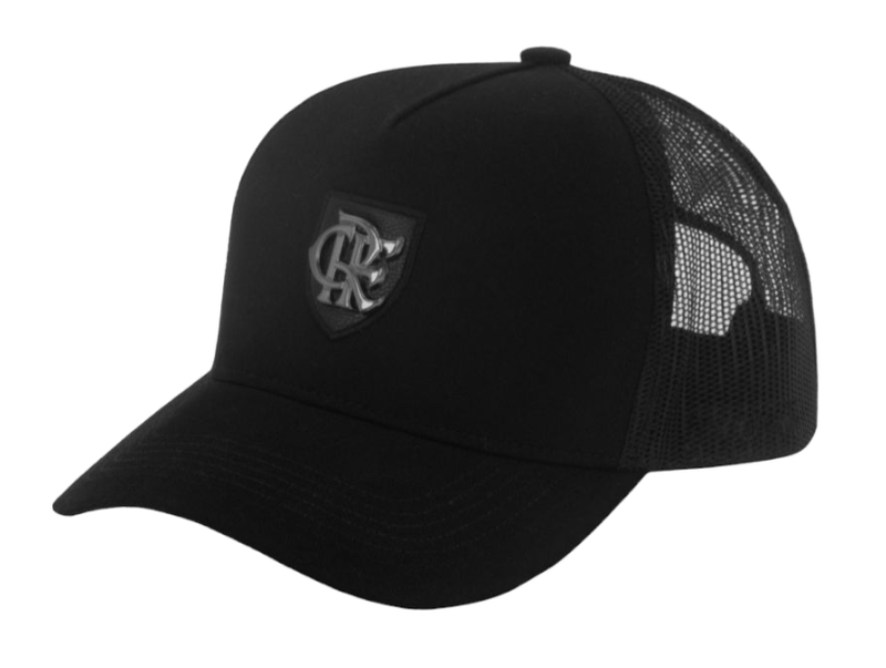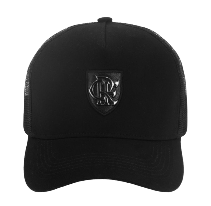 A peça possui tecido em sarja. Na parte frontal do boné apresenta o Escudo CRF Bordado em textura metalizada