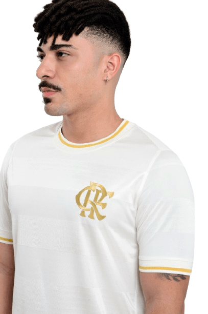 Predominantemente branca, a peça traz o escudo CRF aplicado em dourado no peito, criando contraste elegante e valorizando a tradição rubro-negra sob uma nova perspectiva. A gola careca recebe acabamento em branco com detalhe dourado, repetido também nas mangas, reforçando a harmonia do design.