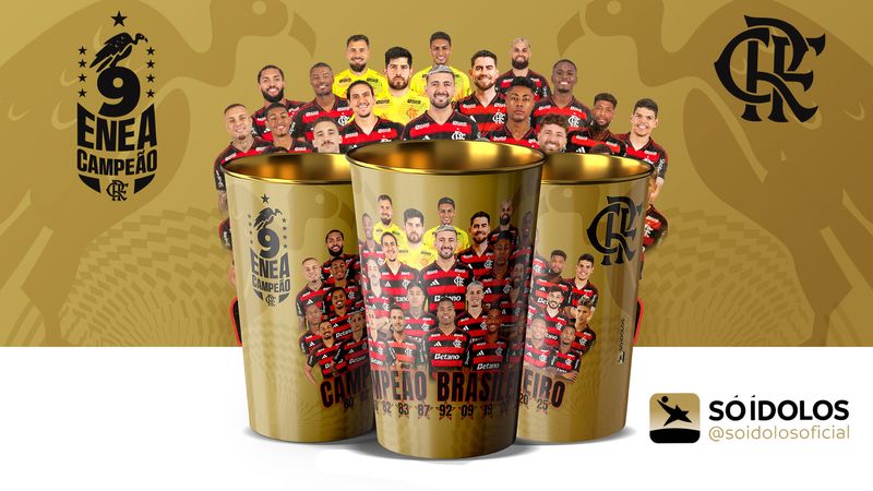 Para celebrar a conquista que coloca novamente o Flamengo no topo do país, chega o Copo Comemorativo ENEA Campeão Brasileiro, uma edição especial produzida pela Só Ídolos para homenagear o 9º título nacional do Mengão.