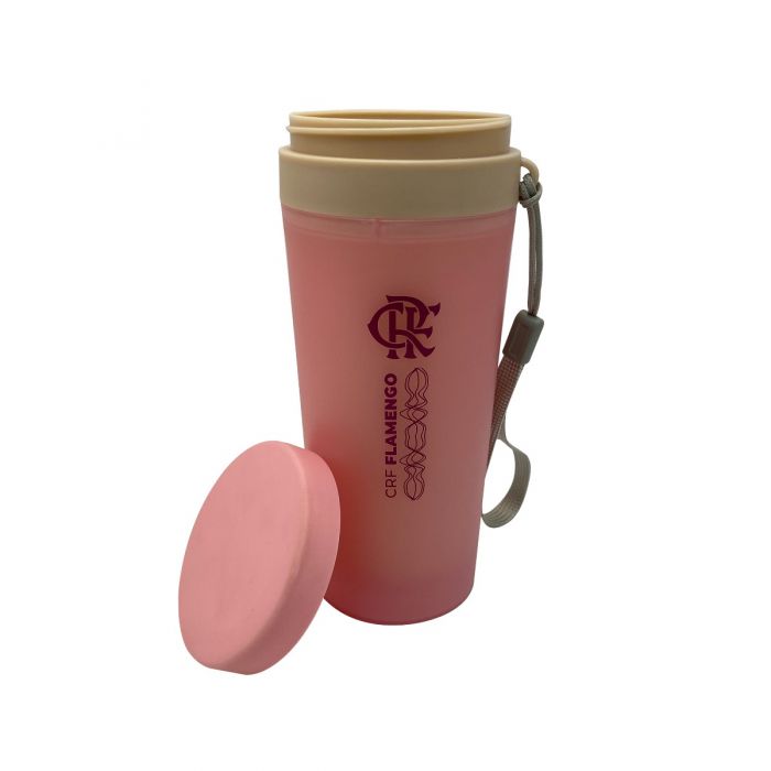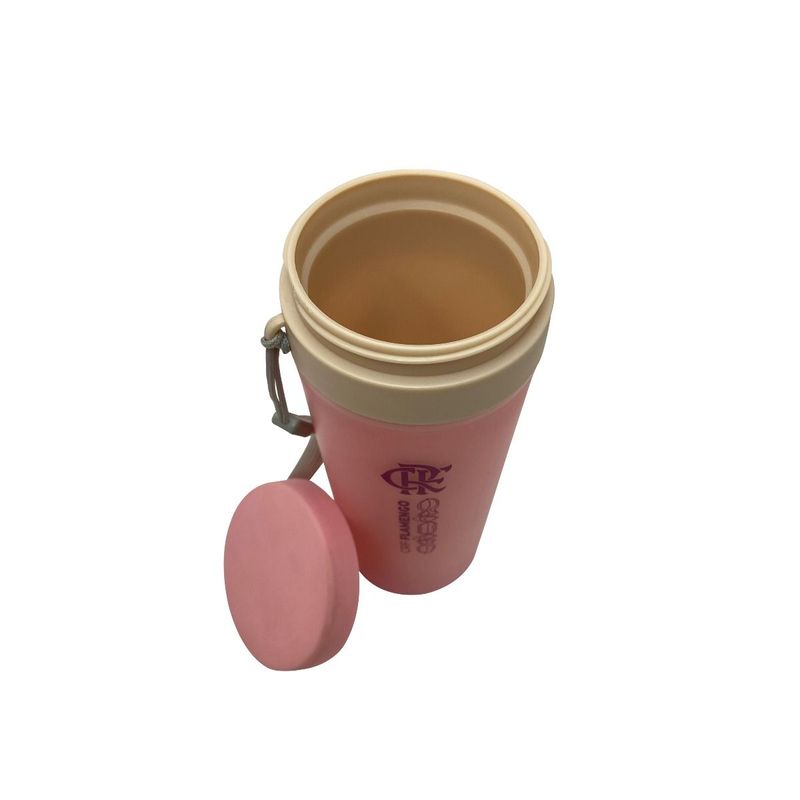 Copo de plástico polipropileno com capacidade para 350ml livre BPA, parede dupla. Acompanha tampa rosqueável e alça de nylon para transporte.