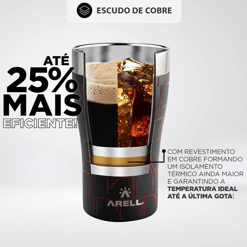Clássico design Tulip Pint, com o pé mais fino e a boca mais aberta, ajuda na formação e retenção de espuma. Perfeito para tomar Pilsen, dirige os aromas de lúpulo direto para o nariz. O revestimento de cobre na parede exterior da parte interna forma um isolamento térmico ainda maior. O cobre reduz a troca de temperatura e isso faz com que os copos Arell sejam até 25% mais eficientes que qualquer outra marca do mercado.