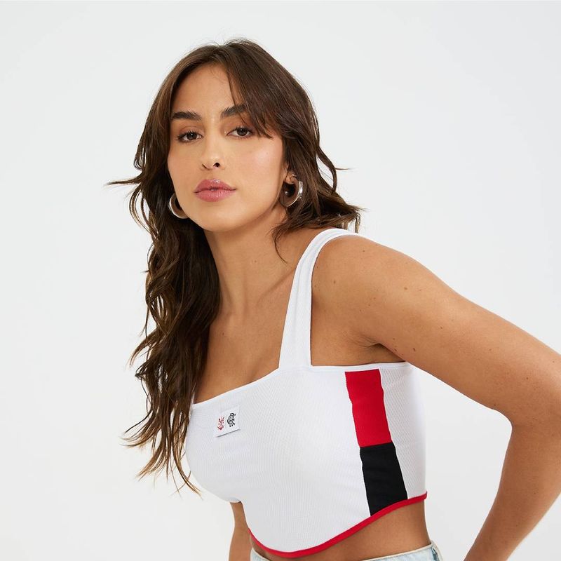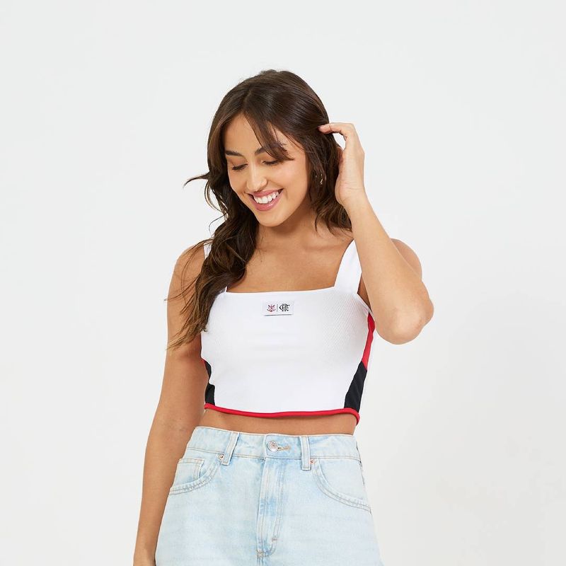 Cropped com etiqueta bordada centralizada, trazendo um visual moderno e cheio de identidade. A peça se destaca pelos recortes rubro-negros nas laterais, que agregam contraste e estilo ao design. Confeccionado em tecido Lummy texturizado, oferece conforto, leveza e ótimo caimento para o dia a dia.