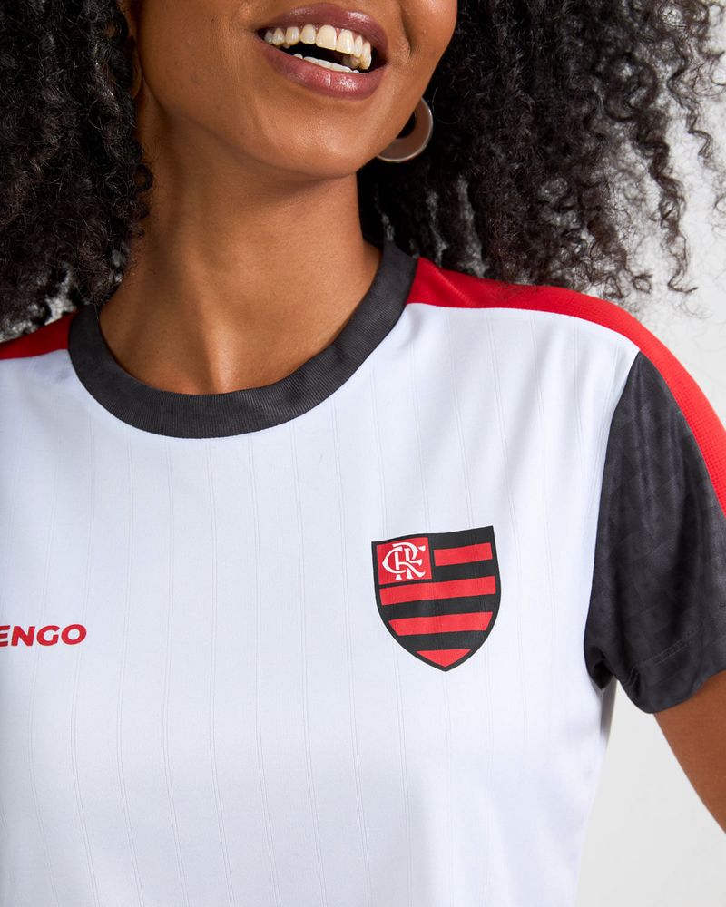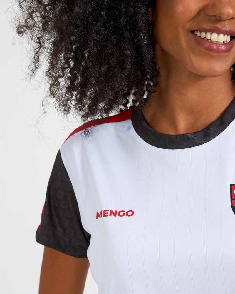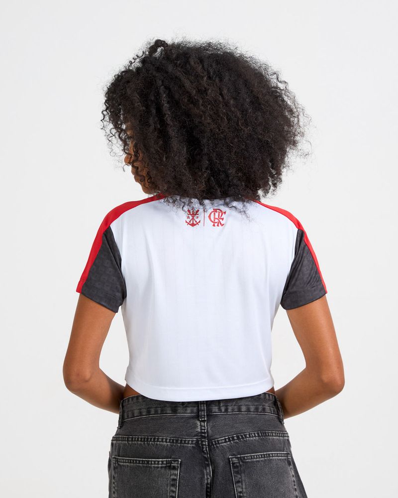 Com mix de tecidos e recortes nos ombros, a peça se destaca pela estampa de toque zero inspirada em cestaria, aplicada na gola e nos detalhes das mangas. Confeccionado em tecido com leve efeito listrado, o cropped absorve e elimina o suor, garantindo melhor transpiração e conforto durante o uso.