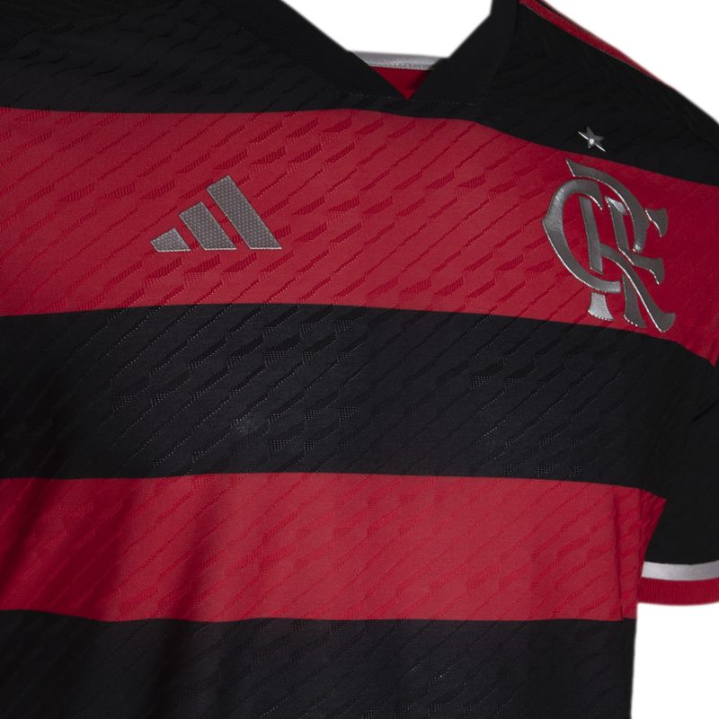 Escudo do Flamengo e logo Adidas estampados por calor (textura em alto-relevo)