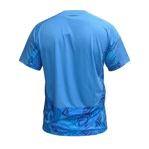 A parte inferior e as laterais trazem grafismos em diferentes tonalidades de azul, adicionando movimento e destaque ao uniforme. Já a parte traseira mantém o visual mais limpo, reforçando a proposta moderna do modelo.