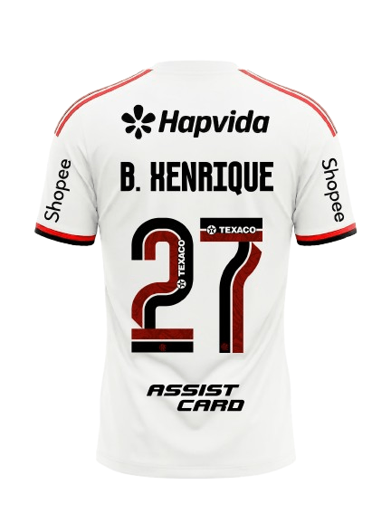 Com base branca imponente e a faixa horizontal em vermelho e preto no peito, o modelo traduz a tradição do clube em uma leitura moderna. Nas costas, o nome B. Henrique e o número 27 ganham protagonismo, representando velocidade, força e decisão em campo.