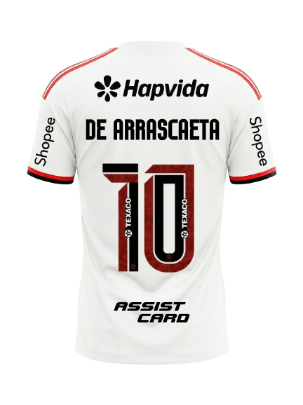 Com base branca imponente e a faixa horizontal em vermelho e preto no peito, o modelo traduz a tradição do clube em uma leitura moderna. Nas costas, o nome De Arrascaeta e o número 10 ganham protagonismo, representando talento, visão de jogo e a criatividade que fazem a diferença.