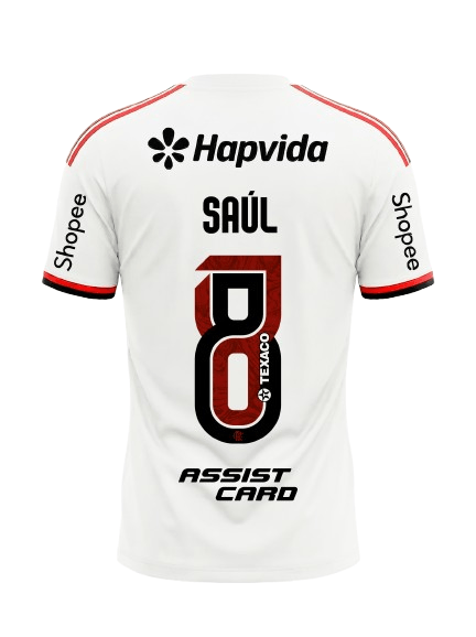 Com base branca imponente e a faixa horizontal em vermelho e preto no peito, o modelo traduz a tradição do clube em uma leitura moderna. Nas costas, o nome Saúl e o número 8 ganham protagonismo, representando intensidade, entrega e domínio no meio de campo.