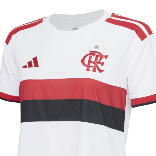 Com design limpo e marcante, a peça traz base branca com a faixa horizontal em vermelho e preto no peito — uma combinação que traduz tradição e modernidade em equilíbrio. Sem aplicação de patrocinadores, nome ou número, o manto valoriza a essência do Flamengo em sua forma mais pura.