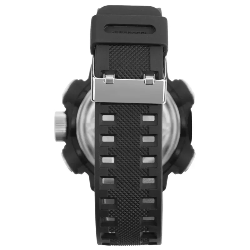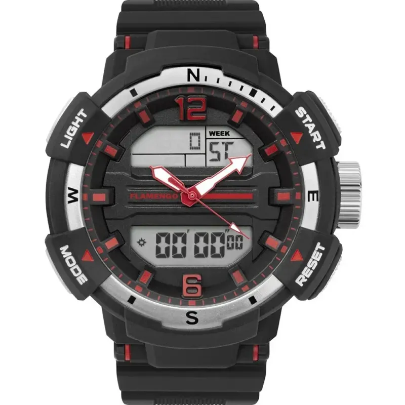Possui mecanismo Analógico/Digital, a pulseira é na cor Preto, fabricada em Resina, com 26 cm de comprimento, 2,1 cm de Largura e possui Fecho Fivela. O Relógio pesa aprox. 67 g. A Caixa (peça onde fica o mostrador) é fabricada em Metal, possui fundo do tipo Parafusado, mede 4,8 cm de diâmetro, sem considerar a coroa, e 1,7 cm de espessura, o que é considerado tamanho Grande para relógios do gênero Masculino. O Relógio Flamengo Masculino FLAMOBJ4097/8R tem nível de resistência à água especificado em 10 ATM. Com relação as funções adicionais do relógio: possui Calendário Digital, Cronômetro Digital, Um Alarme Diário, Não Possui Timer, Não possui função de Aviso de Hora Cheia (Função Chime), Iluminação de Fundo.