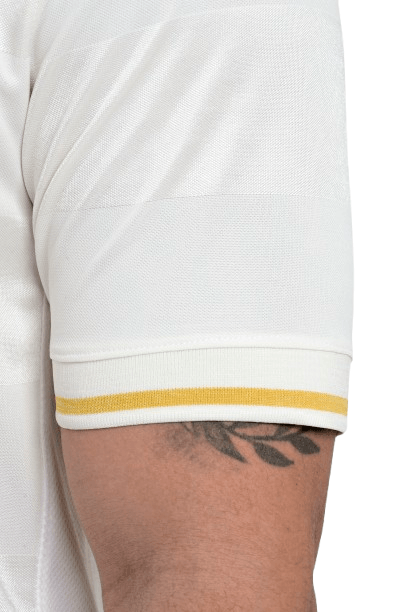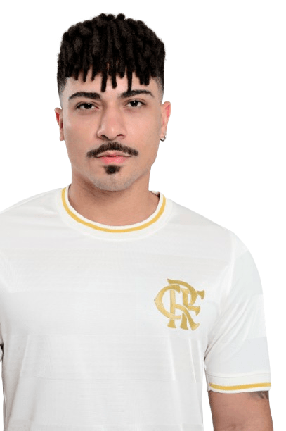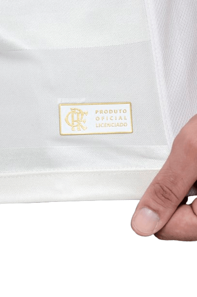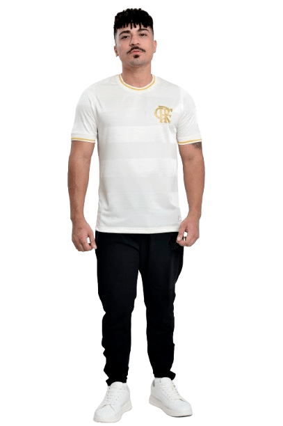 Predominantemente branca, a peça traz o escudo CRF aplicado em dourado no peito, criando contraste elegante e valorizando a tradição rubro-negra sob uma nova perspectiva. A gola careca recebe acabamento em branco com detalhe dourado, repetido também nas mangas, reforçando a harmonia do design.
