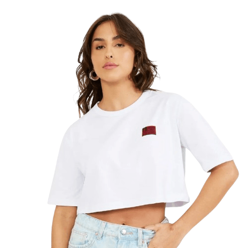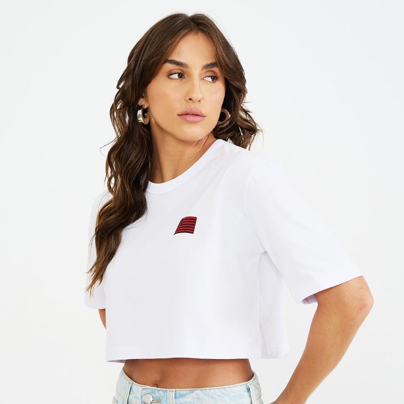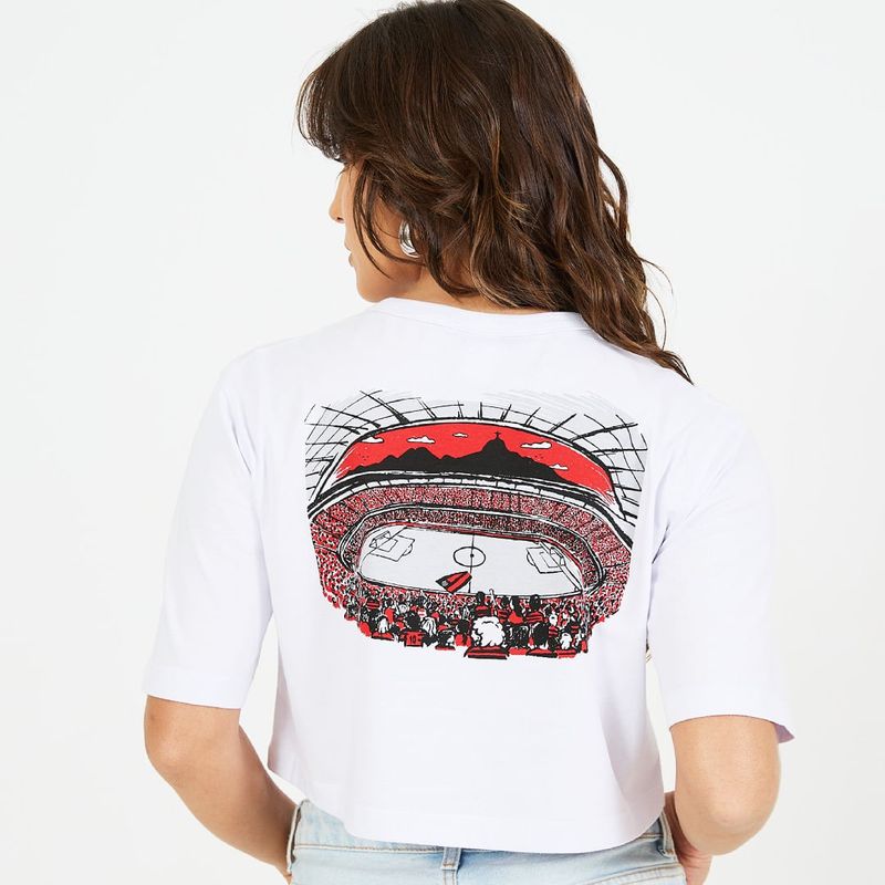 Cropped básico de apelo casual, confeccionado em Meia Malha 30.1 100% algodão, que oferece conforto, durabilidade e maciez ao vestir. O modelo traz design exclusivo, destacando-se pela etiqueta termocolante da bandeira do clube no peito e por uma estampa marcante da torcida no Maracanã com o Cristo Redentor ao fundo, simbolizando a paixão e a força da Nação Rubro-Negra.