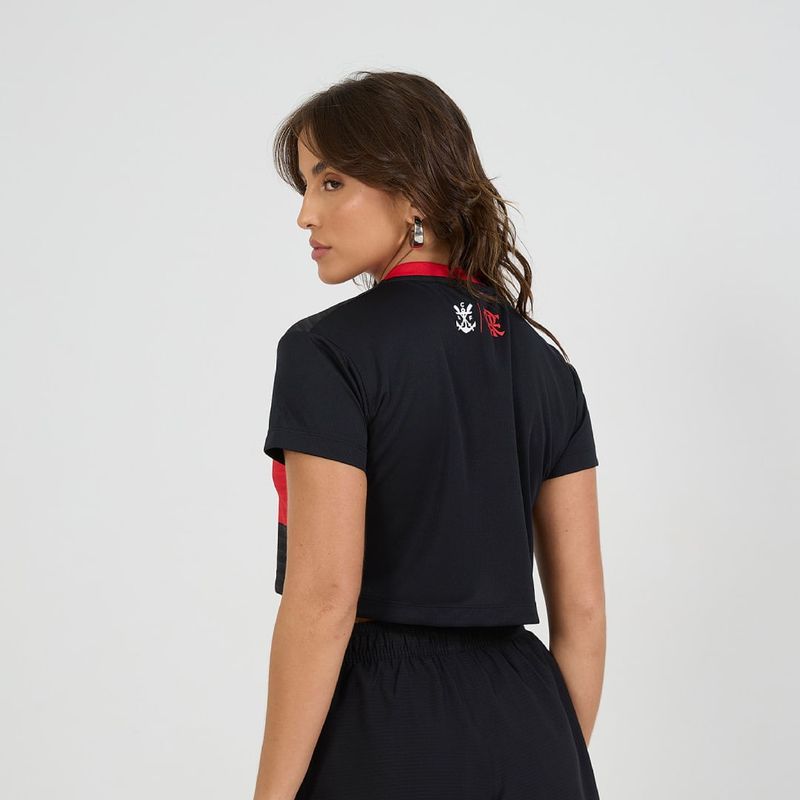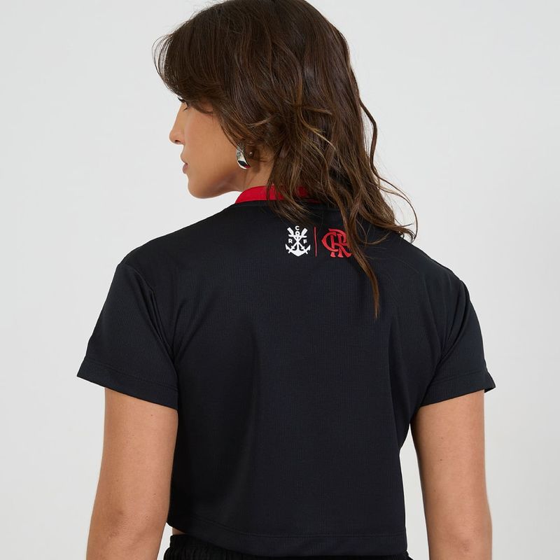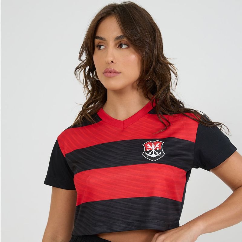 Cropped rubro-negro confeccionado em Dry Max 100% poliéster, tecido leve com excelente caimento, proporcionando conforto e alta respirabilidade, mantendo a pele seca. Possui gola em V e estampa do escudo de esportes aquáticos no peito, com detalhe em toque zero inspirado no movimento das arquibancadas da torcida, transmitindo energia e paixão ao design.